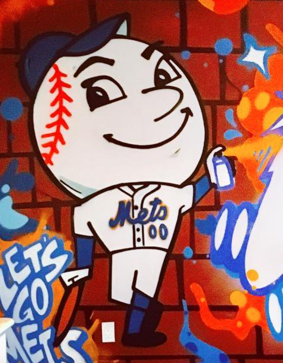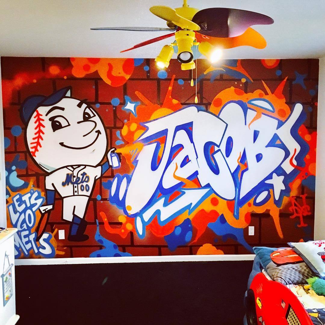 This bedroom mural featured the iconic “Mr. Met”, the beloved mascot of the New York Mets.  The client wished to have Mr. Met spraying the graffiti piece onto a brick wall.  We created a brick wall background that merged with a variety of blues and oranges to match the Mets’ logo colors.  All in all the painting came out great and the client’s child was absolutely thrilled with the work we did.